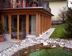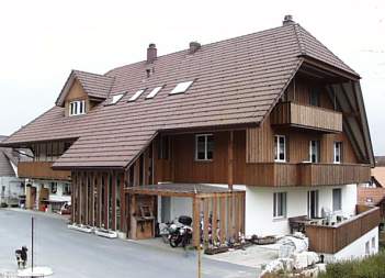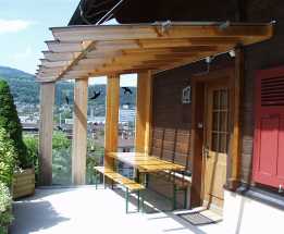 Meist eignet sich älteres Baugut besonders für einen Ausbau mit modernen Holzbauelementen. Hier eine villigrane Vordachkonstruktion, die an ein altes Chalet angebaut wurde.