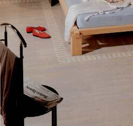 Sandfarbiger Parkett mit Farbmustereinlage. |